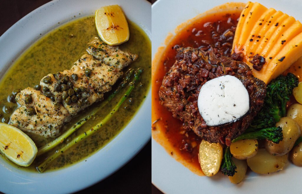 Empezamos, al centro, con unas tostadas de foie gras de pato con mermelada de frutos rojos, escargots Marsella, salteados con vino tinto, chalotes, jengibre y un toque de tocino, además de una fondue de trufa. Como plato fuerte, Phillipe pidió filete de pescado a la meunière (le robé un poco: estaba espectacular). Hanna pidió un filete de res en salsa de jamón serrano con guarnición de papas cambray salteadas y melón al grill, coronado con queso de cabra, una combinación que realmente sorprende al paladar. Yo pedí confit de pato acompañado con papas sarladaise y ensalada. La cocción fue perfecta: por fuera, el ave estaba crocante, y por dentro, suave y jugosa. Para el postre pedimos pastel de chocolate —receta de la casa—, crème brulée y tarta de pera. Todos fueron deliciosos, pero mi favorito fue el primero. Su carta de vinos es muy completa.